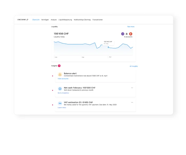 Die Schweizer Open Banking-Initiative schafft die Grundlage für Multibanking. Geschäftskund:innen können im Business Finance Manager, dank Multibanking, mehrere Bankverbindungen von unterschiedlichen Instituten an einem zentralen Ort managen.
